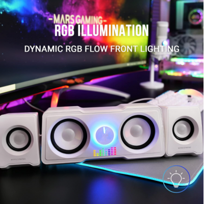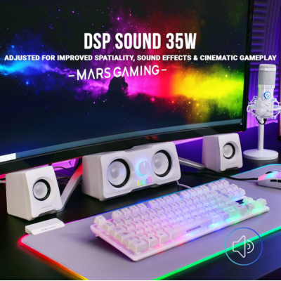 Los altavoces gaming MS22 con alimentación USB y entrada de audio jack 3.5, cuentan con una iluminación RGB Flow dinámica en la parte frontal que le dará un aspecto único a tu setup up. Utilízalos con tus dispositivos favoritos y disfruta de una calidad y potencia de sonido inigualables gracias a su potente sonido DSP de 35W y sus 4 altavoces activos. Controla el volumen fácilmente desde la rueda de control frontal.