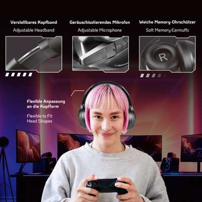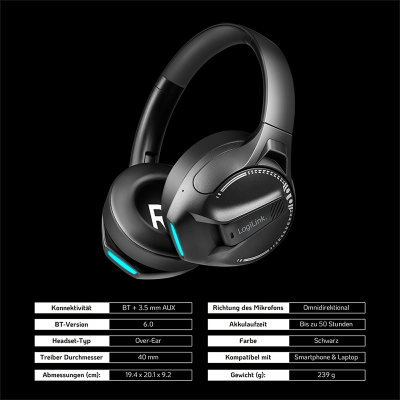 Información del producto "Auriculares para juegos BT 6.0, entrada auxiliar de 3,5 mm, diadema ajustable, batería de 50 horas, color negro".