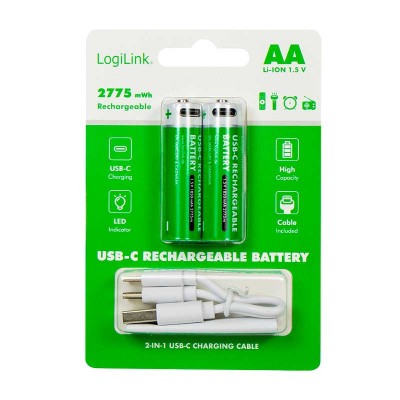 LogiLink ofrece baterías recargables USB-C diseñadas como una alternativa recargable y reutilizable a las baterías desechables. Las baterías Li-Ion AA tienen un voltaje nominal de 1,5 V y una capacidad de 1850 mAh (2775 mWh). Son adecuados para una amplia gama de dispositivos, incluyendo cámaras digitales, controles remotos y controladores de consolas de juegos, máquinas de burbujas, pistolas de juguete, maquinillas de afeitar, micrófonos y otros dispositivos electrónicos. Las baterías se pueden cargar a través de un puerto USB-C integrado. Una carga completa tarda alrededor de 2 horas. El alcance de la entrega incluye un cable USB 2 en 1 que se puede utilizar para cargar dos baterías simultáneamente. Durante el proceso de carga, se ilumina un led verde, que se ilumina continuamente cuando está completamente cargado. Las baterías están diseñadas para más de 1000 ciclos de carga. Las baterías también tienen mecanismos de protección contra sobrecarga, sobrecalentamiento y cortocircuitos.