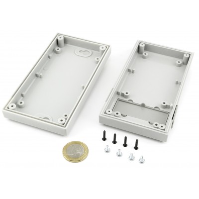 Modelo PP32, una caja fabricada en resistente ABS, este envolvente de esquinas biseladas, que consta de cuerpo, tapa y mirilla, posee unas dimensiones ideales para albergar un dispositivo de uso manual. Cada unidad incluye los tornillos de cierre y de sujeción del circuito. Está disponible en negro y gris (RAL7035).