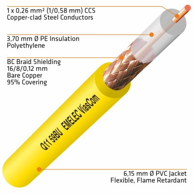 Estos cables coaxiales están cargados con una impedancia de 75Ω. Han sido desarrollados para la transmisión de señal de vídeo. El conductor central es rígido de 0,58 mm de diámetro. Su rendimiento eléctrico es de los mejores en su género.