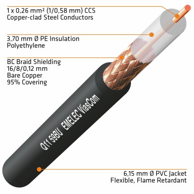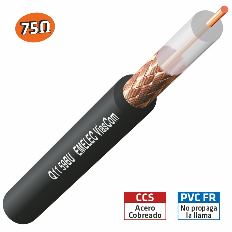 Estos cables coaxiales están cargados con una impedancia de 75Ω. Han sido desarrollados para la transmisión de señal de vídeo. El conductor central es rígido de 0,58 mm de diámetro. Su rendimiento eléctrico es de los mejores en su género.