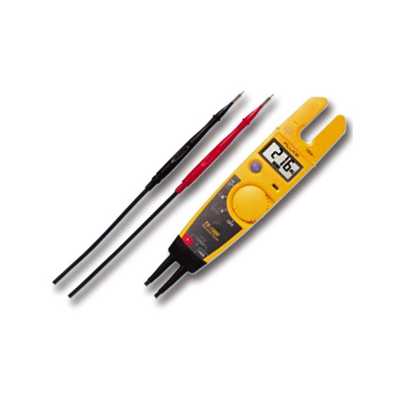 El comprobador eléctrico Fluke T5 le permite medir la tensión, la continuidad y la corriente con una herramienta compacta. Con el T5, sólo tiene que seleccionar voltios, ohmios o corriente y la herramienta hace el resto. OpenJaw le permite comprobar la corriente hasta 100 A sin interrumpir el circuito. Sus robustas puntas de prueba se encuentran en la parte posterior del comprobador, haciendo posible el transporte del T5 en una bolsa de herramientas. Las puntas de prueba extraíbles SlimReach están personalizadas para adaptarse a los estándares eléctricos de los distintos países. Estas puntas aceptan accesorios opcionales, como pinzas o sondas especiales. La funda H5 opcional le permite llevar el T5 colgado en el cinturón. Modelos disponibles de 600 y 1.000 V.
