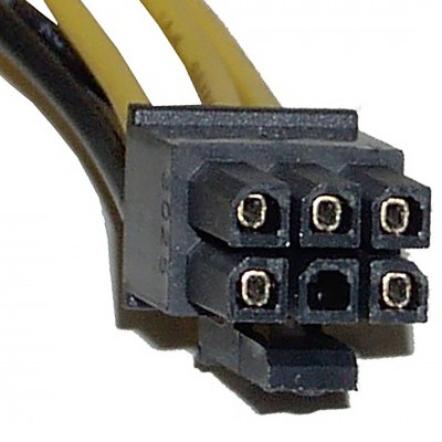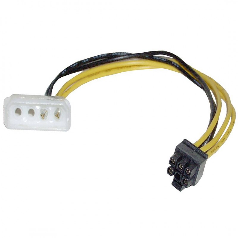 Cable adaptador de 15cm de longitud que en un extremo dispone de conector MOLEX de 4-pin Macho y en el otro extremo de conector para alimentar tarjetas PCI-Express de 6-pin Hembra. Ideal para utilizar fuentes de alimentación ATX estándar que no dispongan de este conector en las nuevas tarjetas PCI-Express que requieren alimentación directa pues consumen más que lo que el bus PCI les puede suministrar. Tipo de conector PCI-EXPRESS: Mini-Fit de 3.96 Pitch. Consulte el pin-out de esta tarjeta en el diagrama adjunto.