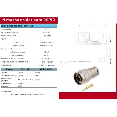 Referencia: VNS102020Conector N macho soldar. Para cable: RG8