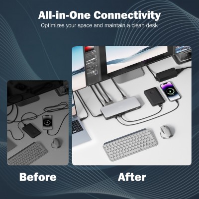 Referencia: DA70918Base de conexión USB-C, 13 puertos, 3 HDMI, 2x DP 4x USB-A, 1x USB-C, 1x RJ45, 1x CC, 1x audio