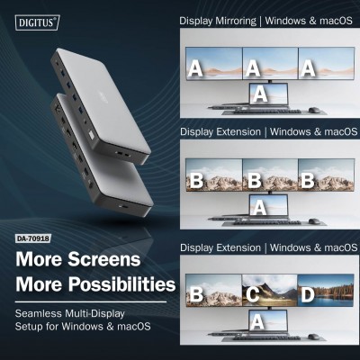 Amplíe su lugar de trabajo con 13 opciones de conexión adicionales y utilice la amplia gama de opciones de conectividad. La base permite configurar monitores dobles o triples (4K/60 Hz en todos los monitores) en modo MST (extensión de pantalla) para Windows, macOS (incluidos los chipsets M1, M2, M3), ChromeOS y PC con Linux. Elija entre 3x conexiones HDMI o 2x DisplayPort y combínelas como desee. Benefíciese de transferencias de datos ultrarrápidas gracias a 3x puertos USB-A 3.2 Gen 1 (5 Gbit/s), 1x USB-A 3.2 Gen 2 (10 Gbit/s) y 1x USB-C 3.2 Gen 2 (10 Gbit/s), algunos de los cuales también admiten la carga de dispositivos móviles a 1,5 A. Una conexión Gigabit Ethernet (RJ45) con 2500 Mbit/s garantiza una conexión de red perfecta. La fuente de alimentación suministrada (21 V/7,1 A, 150 W) suministra suficiente energía a la base de conexión y al portátil durante su uso. La toma de audio de 3,5 mm y el cable de conexión USB-C 3.2 Gen 2 reversible de 100 cm ofrecen flexibilidad adicional. La estación de acoplamiento admite DP 1.4 Alt Mode (compatible con DP 1.2), HDR y HDCP 2.2/1.4. Tenga en cuenta que se requiere una instalación manual de controladores (DisplayLink) para su sistema operativo para utilizar la funcionalidad completa (monitor doble/triple y audio) de la base de acoplamiento.