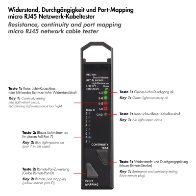 - Este comprobador de cables de red Micro RJ45 3 en 1 y económico permite comprobar la integridad de un cable Ethernet y diagnosticar problemas con rapidez y precisión. Permite detectar cortocircuitos, circuitos abiertos y cableado incorrecto, así como comprobar la alta resistencia y buscar puertos remotos. Además, la medición de resistencia verifica la capacidad de transferencia de energía para aplicaciones PoE.