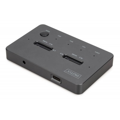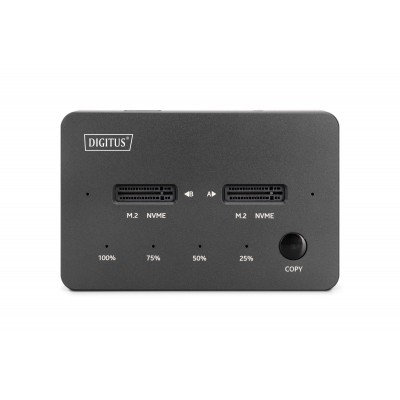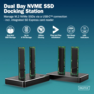La DIGITUS® Dual NVMe Docking Station DA-71545-1 ofrece una potente solución de almacenamiento para profesionales y entusiastas de la informática. Con espacio para dos SSD M.2 NVMe (hasta 4 TB por ranura), permite transferencias de datos a alta velocidad y una función de clonación offline integrada que permite duplicar fácilmente los soportes de datos con solo pulsar un botón.