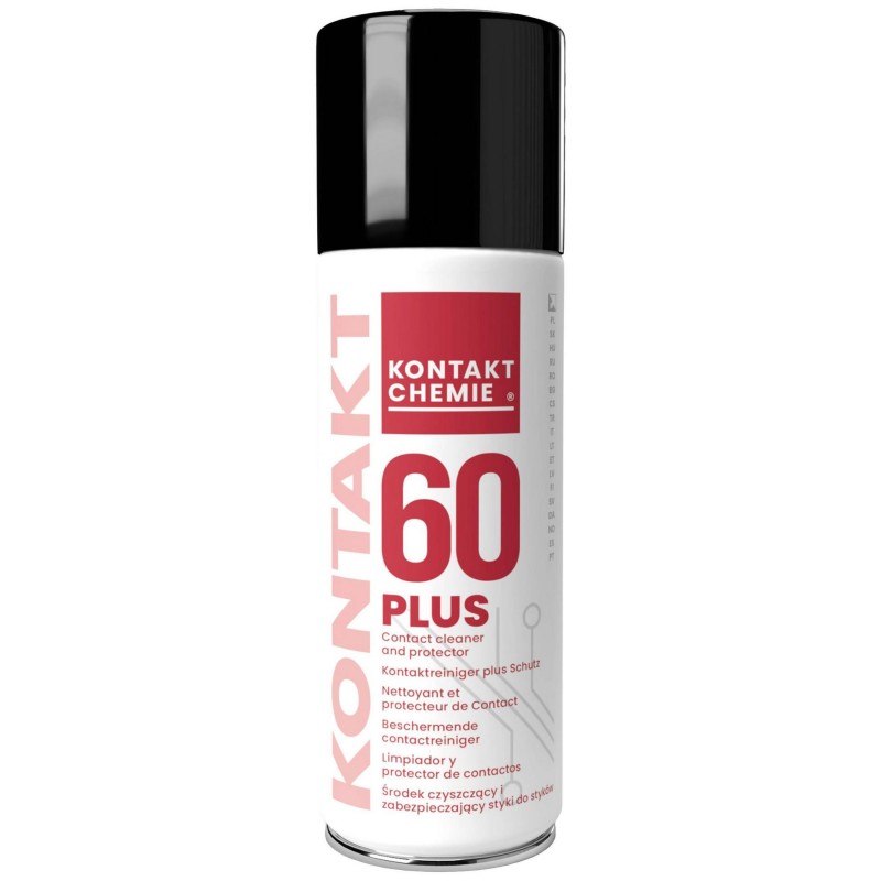 KONTAKT CHEMIE Kontakt 60 es un aceite limpiador de contactos que puede utilizarse para restaurar contactos eléctricos corroídos. En forma de aerosol, es especialmente adecuado para aplicaciones de mantenimiento, ya que puede dispensarse de manera económica y precisa (con un tubo pulverizador especial). Además de los componentes que disuelven la corrosión, el aerosol contiene una mezcla de disolventes que también elimina residuos grasos o resinosos. Los problemas con los contactos eléctricos no se deben únicamente a la corrosión, sino también a gases contaminantes que forman capas de baja conductividad eléctrica sobre las superficies de contacto ("polímeros").