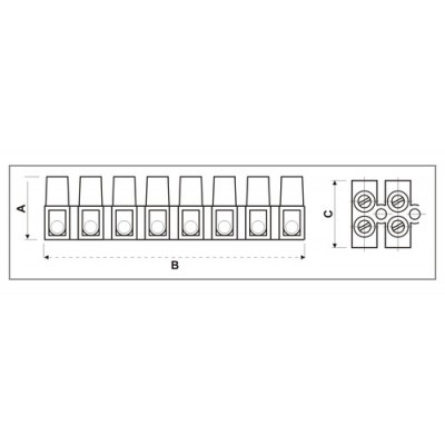 Características Sección 16 mm² Dimensiones A 26 mm B 190 mm C 30 mm Tipo conexión Color blanco Intensidad 40 A - 76 A Temperatura de trabajo 110 ºC (UL - V0) Material poliamida 6 Tensión nominal (´) 450 V Presentación 5 unidades en bolsa Nº polos 12