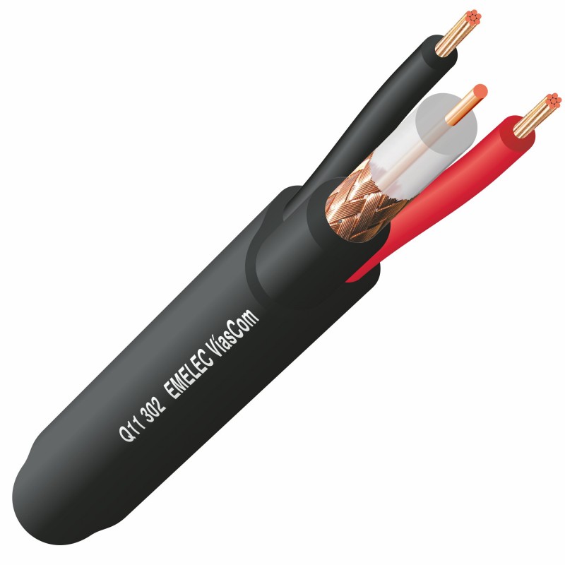 Cable compuesto por un RG59 de 75 Ω y dos conductores de alimentación de 0,55 mm² para CCTV videocámaras e instalaciones que requieran una línea de vídeo y otros servicios en un mismo cable. Disponible en blanco o negro.